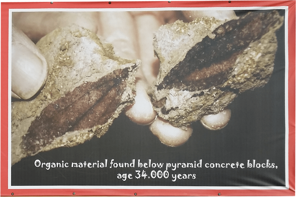 Pyramiderna är täckta med artificiell betong överlägsen den bästa betong man kan tillverka idag (134MPa och 1% vattenabsorbering att jämföra med 100MPa och 2% vattenabsorbering för den bästa cement som kan tillverkas idag), enligt oberoende tester utförda av materialinstitut i Frankrike, Bosnien och Italien. Detta omöjliggör den löjliga anklagelsen att pyramiderna skulle vara tillverkade i modern tid av Solpyramidstiftelsen, som utför utgrävningarna.