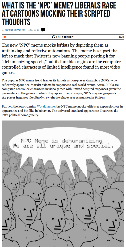 I fallet med dessa memes görs det iallafall med humor och medkänsla. En NPC kan till skillnad från en bott bli en PC (playable charachter). Till skillnad från en nazist är en NPC ingen förhatlig ond person. Samtidigt är det inte NPC’s fel, för varifrån kommer programmeringen? Dessa memes är också mycket mer träffande.