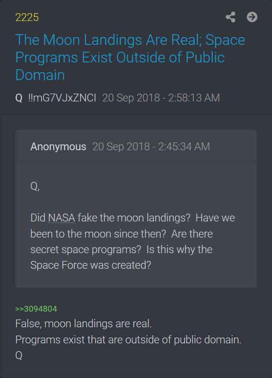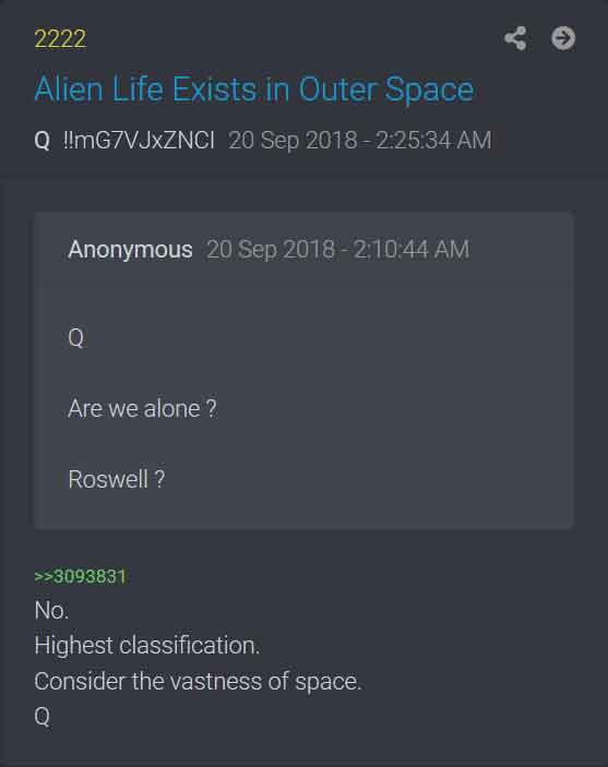 • 20 september 2018 Q bekräftar i drop #2225 att det existerar hemliga rymdprogram och i drop #2222 att vi inte är ensamma i universum