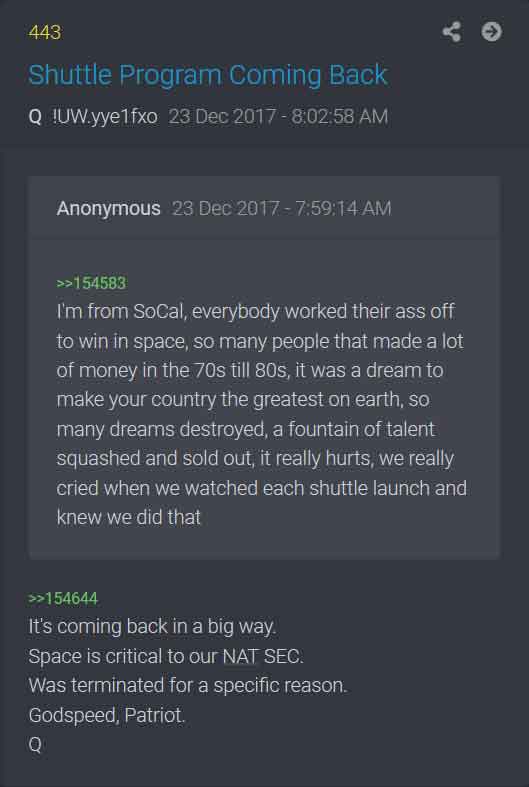 • 23 december 2017 Q säger i drop #443 att rymdprogrammet kommer komma tillbaka stort och att det är kritiskt för nationens säkerhet