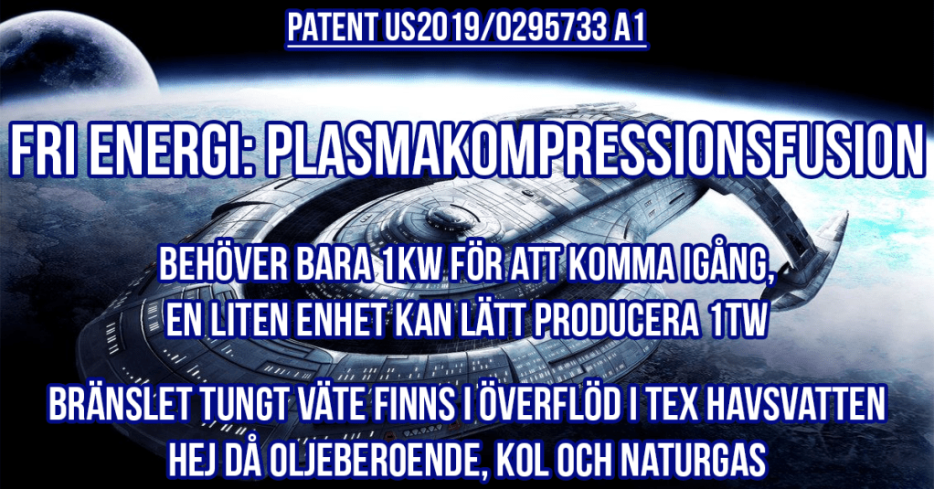 Otroligt? Vi börjar med att 26:e september 2019 – bara tre dagar efter Gretas tal vid FN och en klimax av klimathysteri – offentliggjordes amerikanska flottans ansökan om patent på en ”Plasma compression fusion device”, eller på svenska en fusionsreaktor som drivs genom plasmakompression, i ansökan US2019/0295733 A1 av USPTO (US Patent Office). Följ gärna länken för att komma till ansökan och läs detaljerna samt förklaringen av fysiken som möjliggör teknologin.