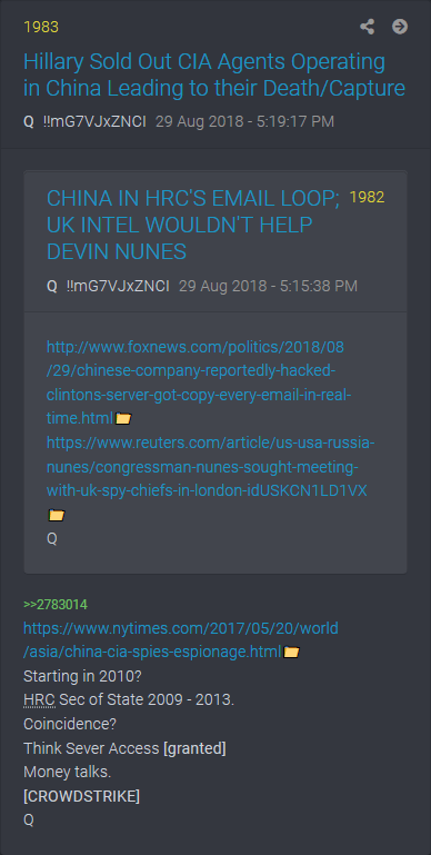 Q drop #1983 visar att Hillary sålde tillgång till sin mailserver via Crowdstrike. Se mitt inlägg om Q.