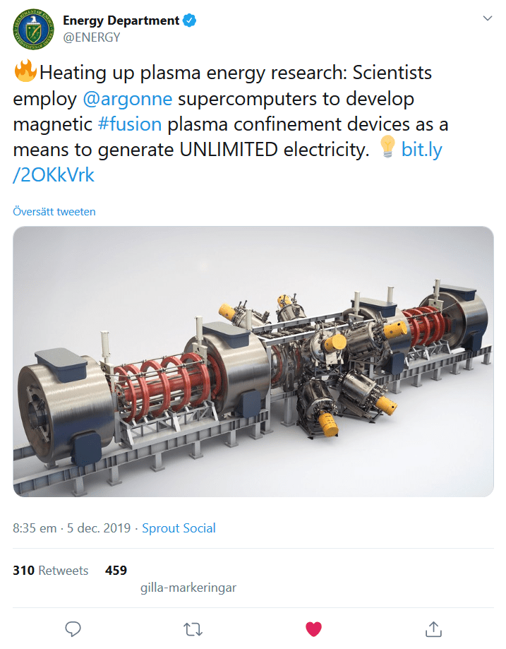 Amerikanska DOE (Department of Energy) gick lite drygt 2 månader efter att patentansökan publicerades, den 5 december 2019, också ut med följande tweet om obegränsad elektricitet i form av fusionskraft: