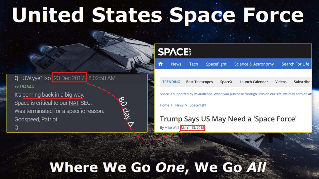 Trump annonserade tidigt under sitt presidentskap (lite drygt ett år efter tillträdet) att han vill bygga Space Force som en egen del av armén, och kan därmed sägas infria det löfte Q gav 4 månader dessförinnan om att rymden kommer komma tillbaka in a big way.