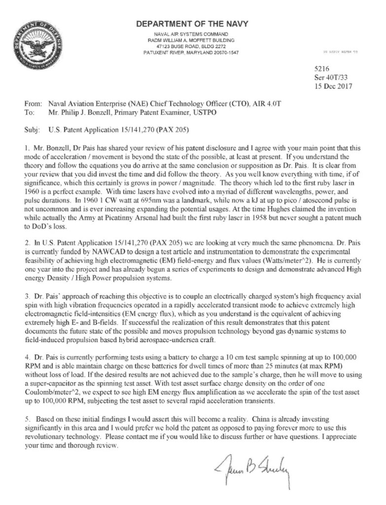 Den ansvarige på amerikanska patentverket, som skulle utvärdera ansökan om kraftfältgeneratorn, tyckte också att det lät lite väl konstigt och utanför ramarna för det möjliga i nuläget, och avslog därmed ansökan. Då hörde flottans chef över avancerad flyg- och rymdteknik av sig och intygade att både supraledaren och den kraftfulla elektromagnetfältgeneratorn fungerar och är i drift, vilket övertygade den ansvarige på patentverket att godkänna ansökningarna.
