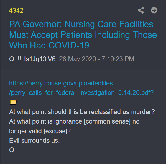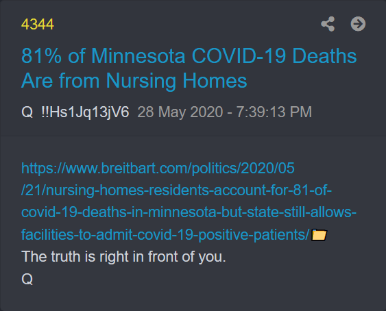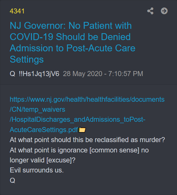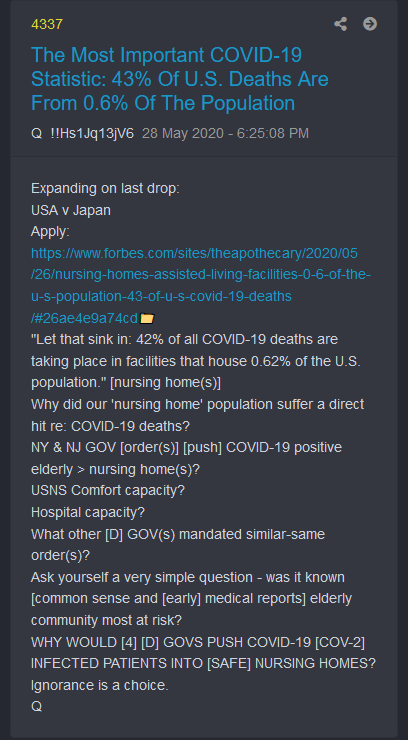 I slutet av maj postade Q Anon (se t.ex. mitt inlägg här på bloggen om Q om du inte känner till det så väl) en hel serie s.k. drops om hanteringen av Covid-19, som även känns igen ifrån Sverige och en del andra länder. Vi kan se att samma playbook använts på olika håll i världen med stora likheter i hanteringen. Nedan ett urval märkvärdiga händelser.