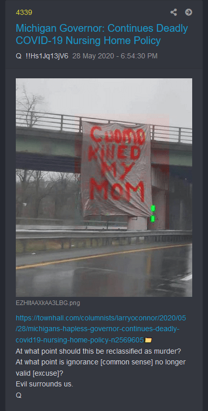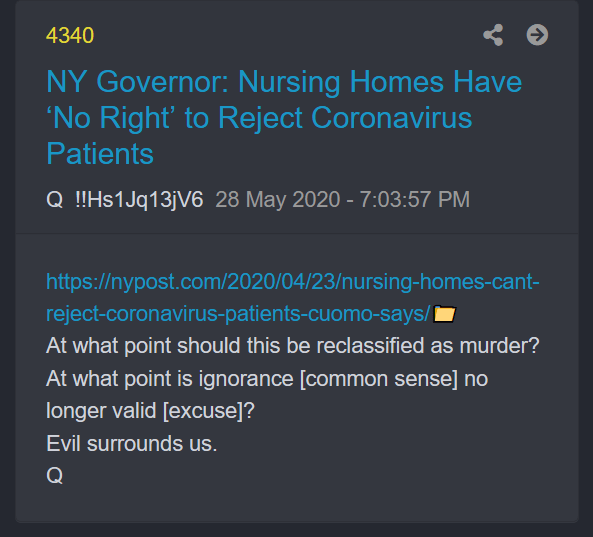 New Yorks guvernör Cuomo fick stora donationer från äldreboenden och gav dem därefter immunitet vad gäller den fatala hanteringen av de äldre. Hälsomyndigheten i New York utfärdade tidigt riktlinjer om att skicka äldre smittade till äldreboenden (”nursing homes”), men försökte sedan gömma det genom att radera riktlinjerna (som finns kvar på archive.org):