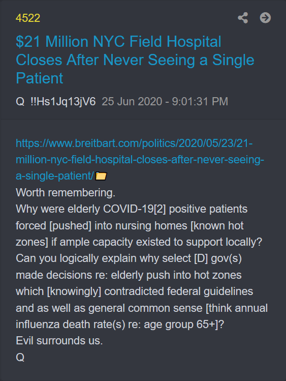 Privatpersoner i hela världen har tagit saken i egna händer och gått och filmat sjukhus som på TV påståtts vara rena krigszoner p.g.a. covid-19, med högar av lik, men som visat sig vara helt tomma. I länken i bilden nedan kan vi se att ett fältsjukhus stått helt oanvänt i New York, likt sjukhusfartyget USS Comfort Trump skickade till New York som till 90% var oanvänt, samtidigt som äldre skickats till äldreboenden, precis som i Sverige:
