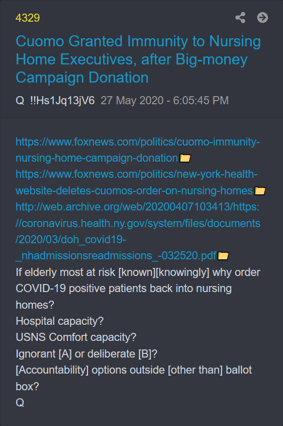 https://www.foxnews.com/politics/cuomo-immunity-nursing-home-campaign-donation📁https://www.foxnews.com/politics/new-york-health-website-deletes-cuomos-order-on-nursing-homes📁http://web.archive.org/web/20200407103413/https://coronavirus.health.ny.gov/system/files/documents/2020/03/doh_covid19-_nhadmissionsreadmissions_-032520.pdf📁
