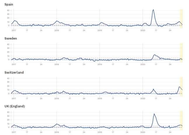 Om vi tittar specifikt på Sverige och bryter upp det tydligare i veckor har vi denna bild: