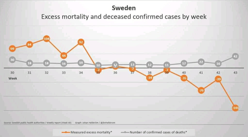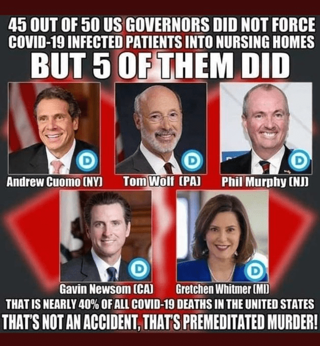 Detta är jämförbart med USA, där guvernörerna i 5 delstater – alla s.k. ”demokrater” (läs: socialister och lakejer till djupa staten) – beslutade om att äldre inte skulle få vård, utan istället trängas på nursing homes (äldreboenden). Det gjorde de trots att de hade fått generella riktlinjer uppifrån om att inte göra så. Dessa katastrofala beslut ledde till att dödsfallen som ägde rum på nursing homes i dessa 5 delstater (av 50) stod för 40% av alla dödsfall i USA – en ganska klar överrepresentation!