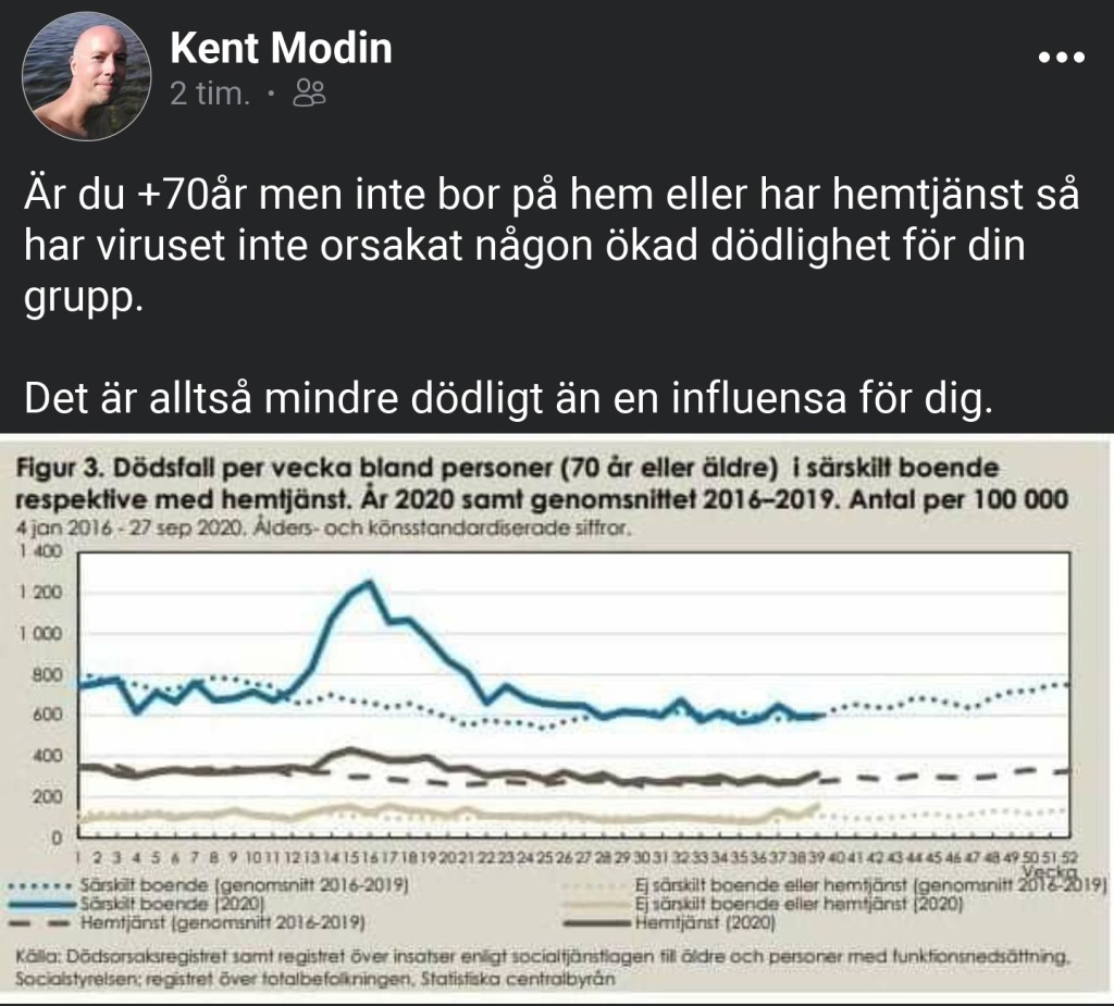 Tvärtom kan vi lugna alla äldre (och alla som bryr sig om äldre) – som inte bor på ”särskilt boende” eller har ”hemtjänst” – med att viruset inte orsakat någon ökad dödlighet att tala om ens för personer som är 70+, när man bryter ner statistiken över olika boendeformer.