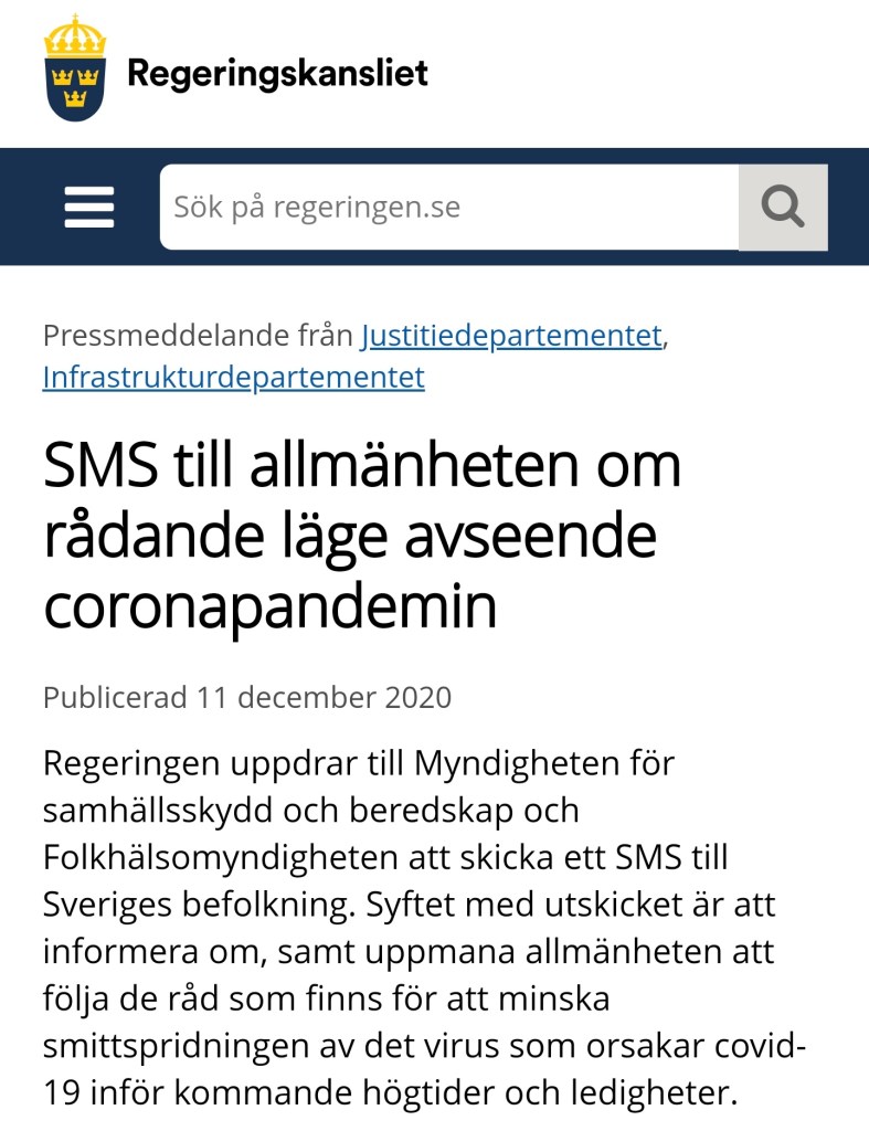 Dagen till ära – alltså dagen då regeringens textmeddelande ämnat att skrämma upp befolkningen och förskjuta diskursen ytterligare i riktning mot noll tolerans vad gäller kritik av åtgärderna skickades ut – kom även promemorian för den nya pandemilagen ut, som går att ladda ner via länken nedan. Vilket sammanträffande!