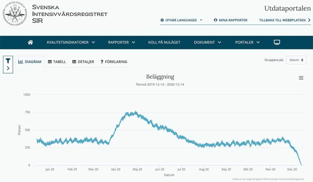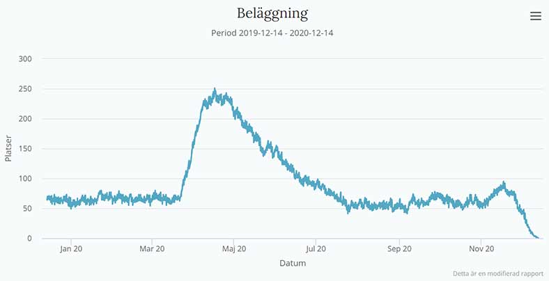 Men om vi tittar in på Svenska Intensivvårdsregistret (SIR) https://portal.icuregswe.org/utdata/sv/report/prod.belaggning finner vi följande för hela riket:
