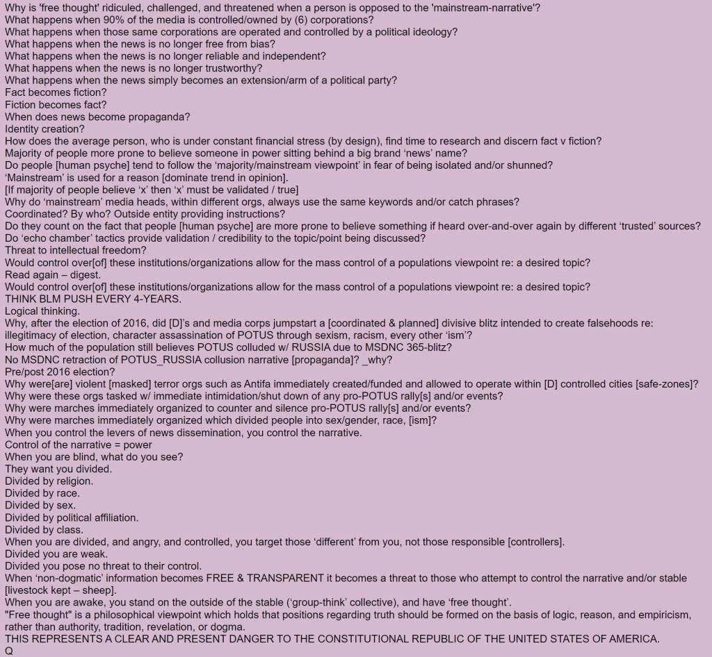Men förhoppningsvis kan en och annan nyvaken, eller på ett eller annat sätt vilseledd, ta till sig detta och fundera över hur Q kan svartmålas så in i bomben, samt varför, och vilka krafter som ligger bakom, och vad Q-rörelsen egentligen handlar om. Men även vilka enorma krafter vi har att kämpa mot, och hur starka vi kan bli om vi inte har en falsk världsbild (där det vi tror är bra för oss är dåligt för oss och vice versa) men jobbar tillsammans för allas väl.