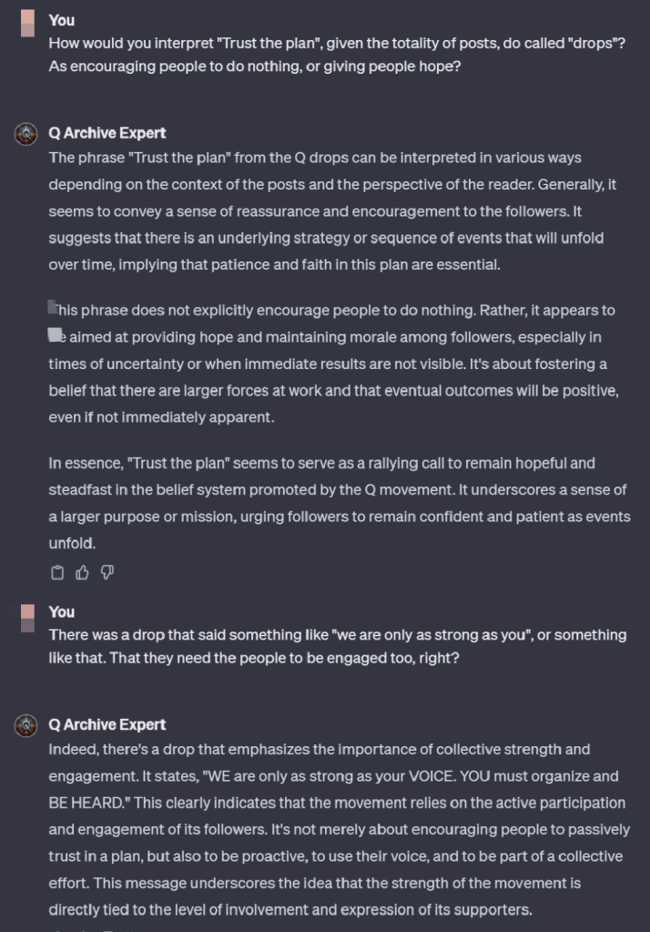 Det är inte så det tolkas av Q community, så låt se hur en hyfsat opartisk AI som definitivt inte är välvilligt inställd till Q, som får gå igenom allt material, tolkar uttrycket ”trust the plan”: