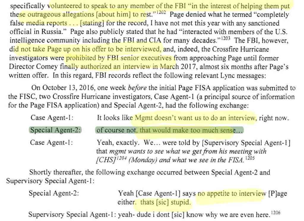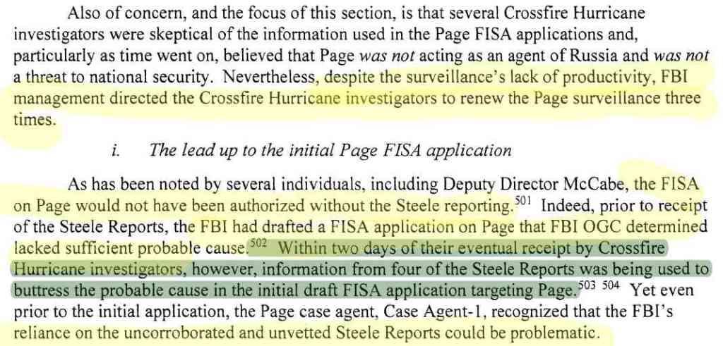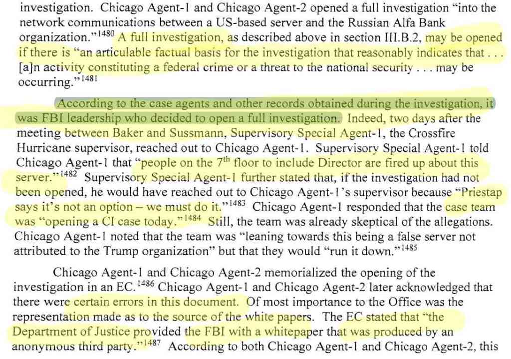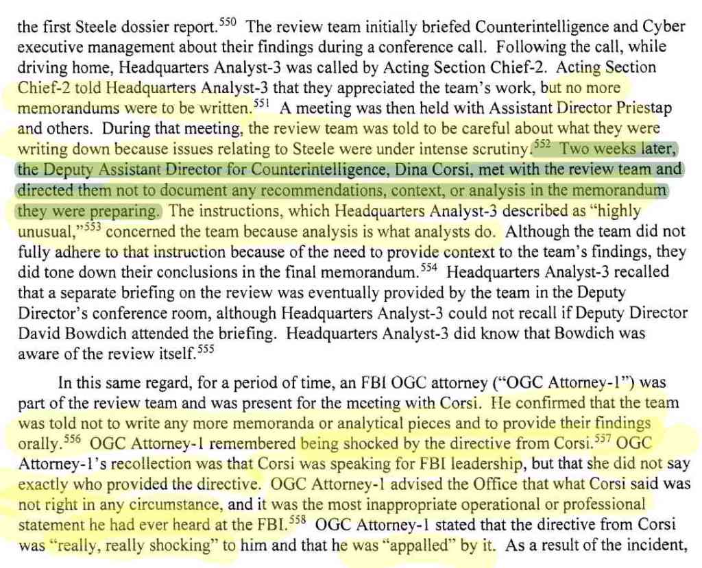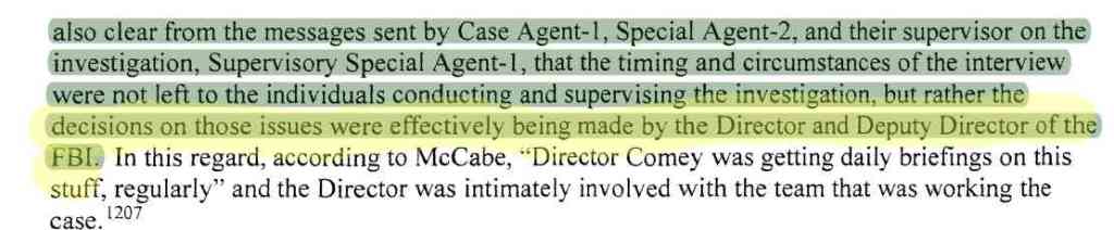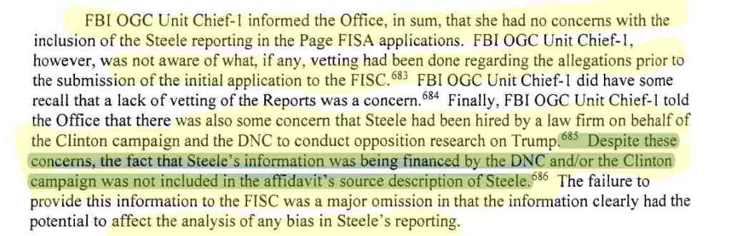 Ledningen för FBI visste alltså att Hillary hade för avsikt att svartmåla Trump på detta vis, när de mot all praxis, utan bevis och enbart löst baserat på hörsägen utan att validera källor inledde en fullständig undersökning av Trump och medarbetare i hans valkampanj. De som jobbade med undersökningen fick däremot inte ens veta att Hillary hade en sådan plan och att hon och DNC hade beställt och betalat för rapporten (Steele dossier) som låg till grund för hela narrativet.