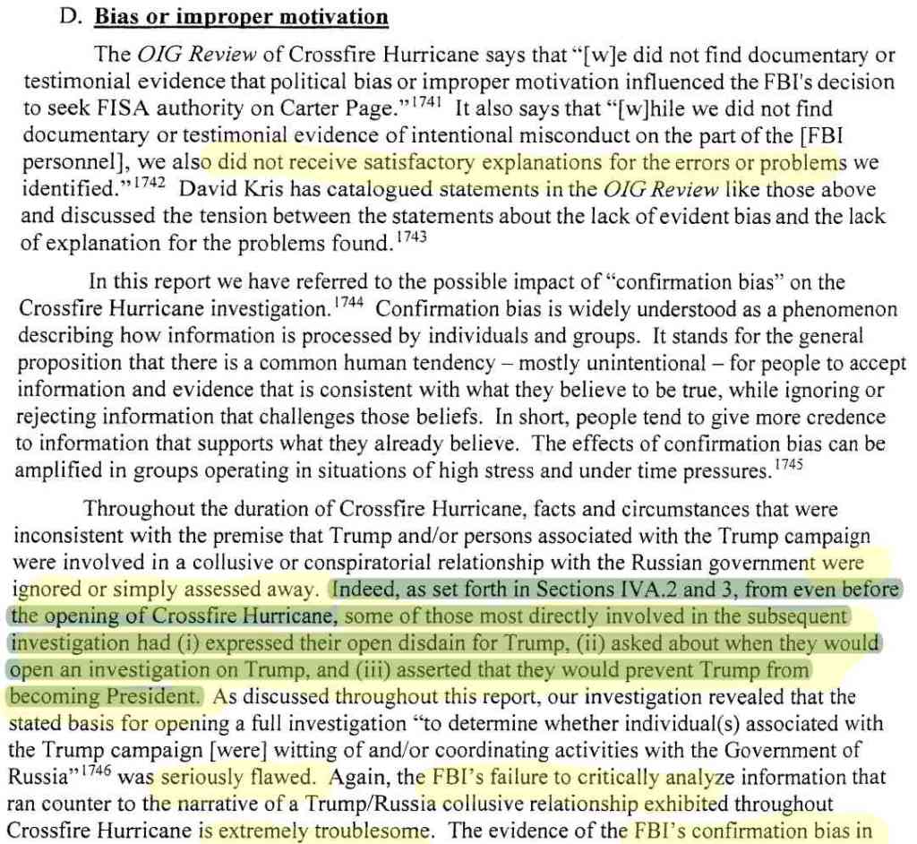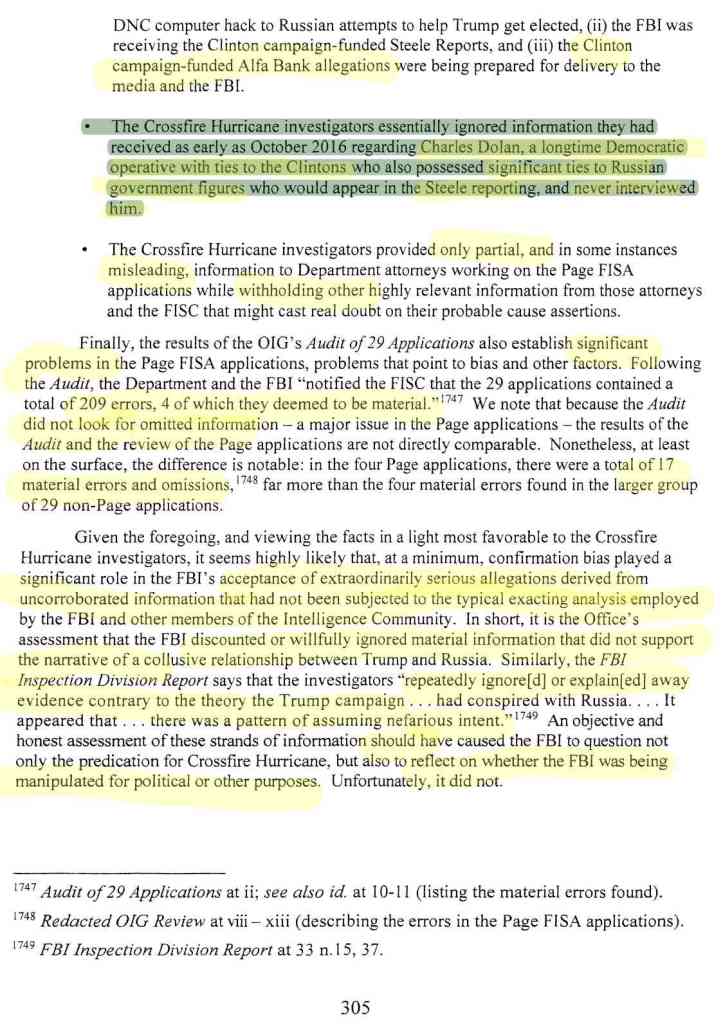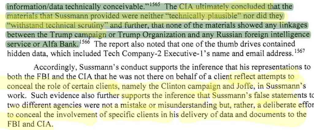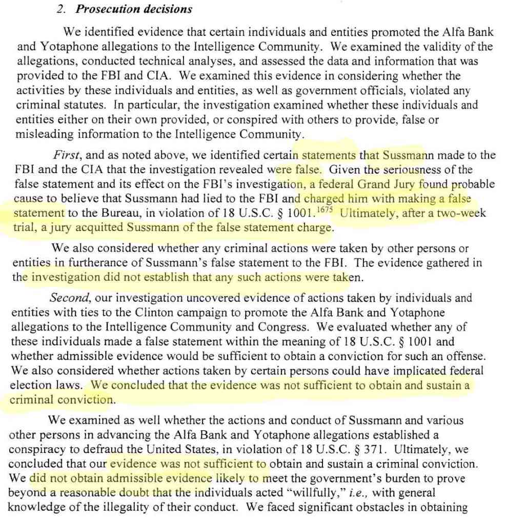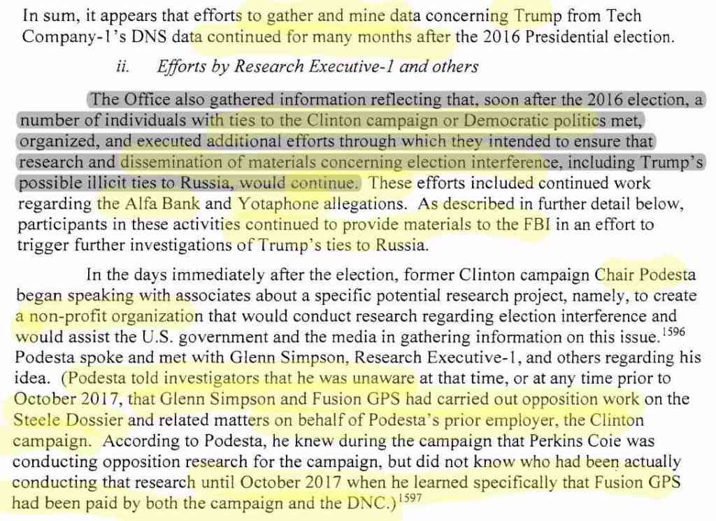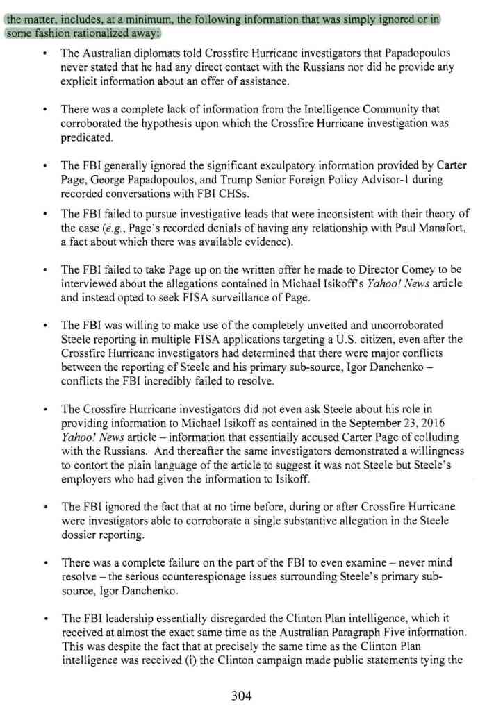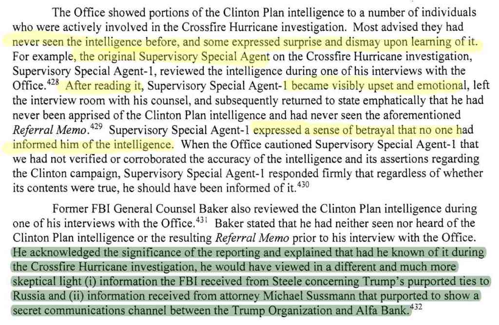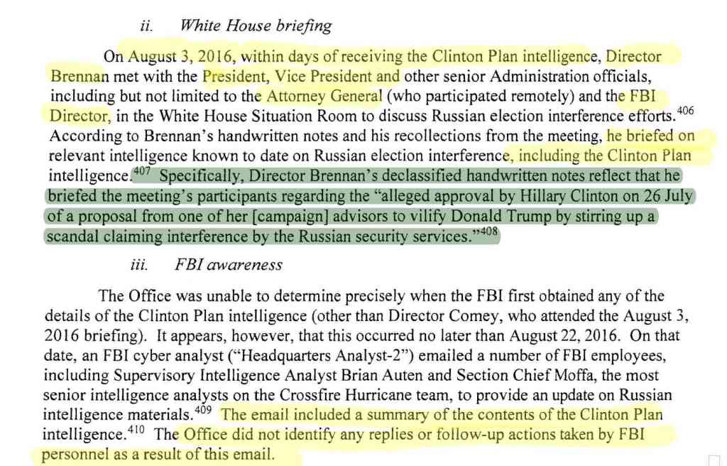 I rapporten framkom bland annat att chefen för CIA, John Brennan, några dagar innan FBI:s undersökning (kallad Crossfire Hurricane) om eventuellt samröre mellan Trump och Ryssland inleddes, informerade bland annat Obama och Biden (som då var president resp. vice-president ) samt FBI-chefen James Comey om att Hillary Clinton hade en plan som gick ut på att svartmåla Trump och låta påskina att ett sådant samband av ryskt inflytande skulle finnas. Man får anta att några anledningar var för att avleda bland annat från hennes egna privata mailserverskandal, och för att fortsatt ta emot mutor från utlandet via Clinton Foundation (donationerna till Clinton Foundation sjönk som en sten efter att det visade sig att hon inte blev president).