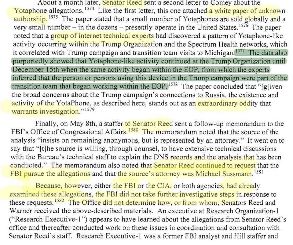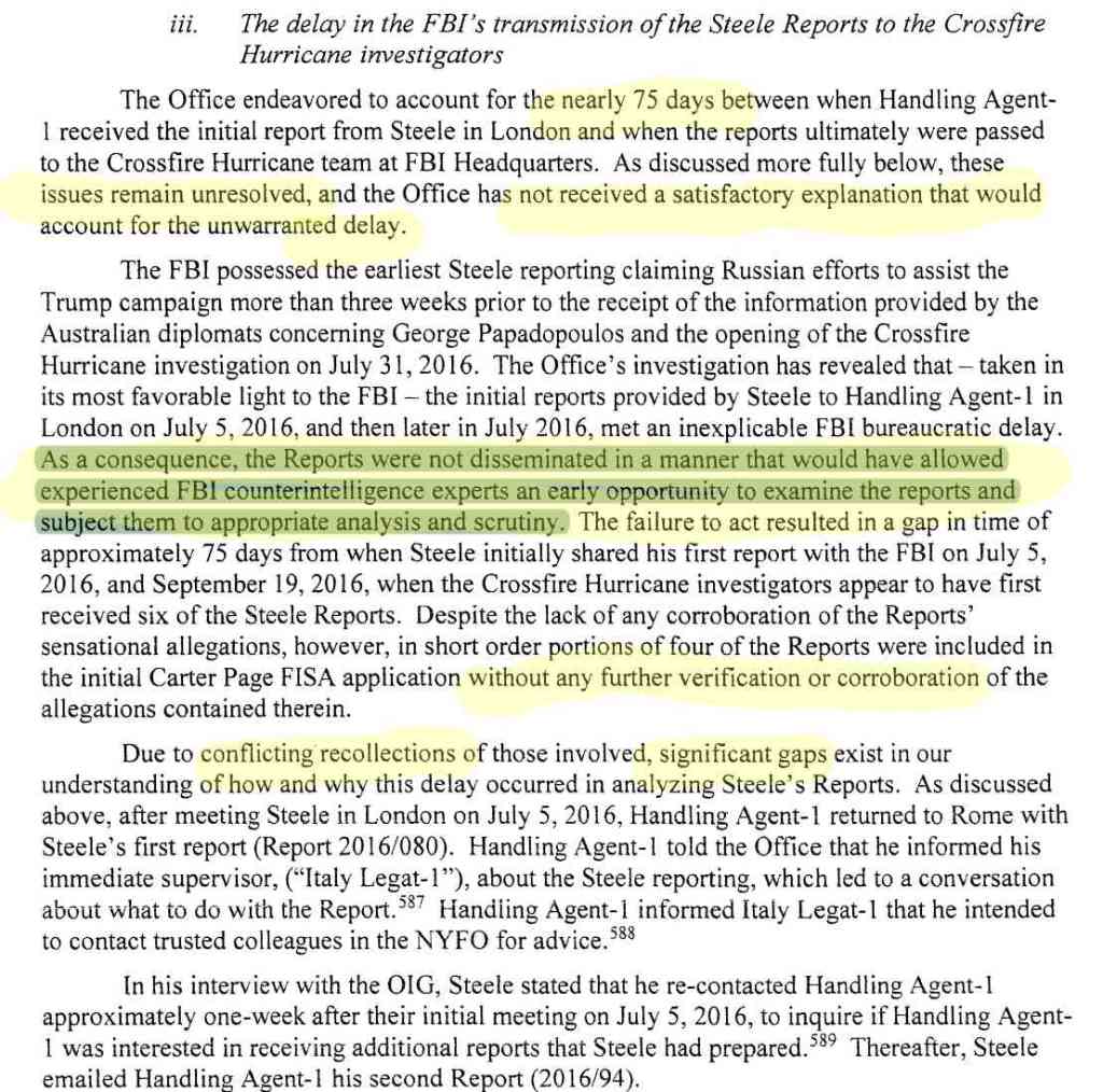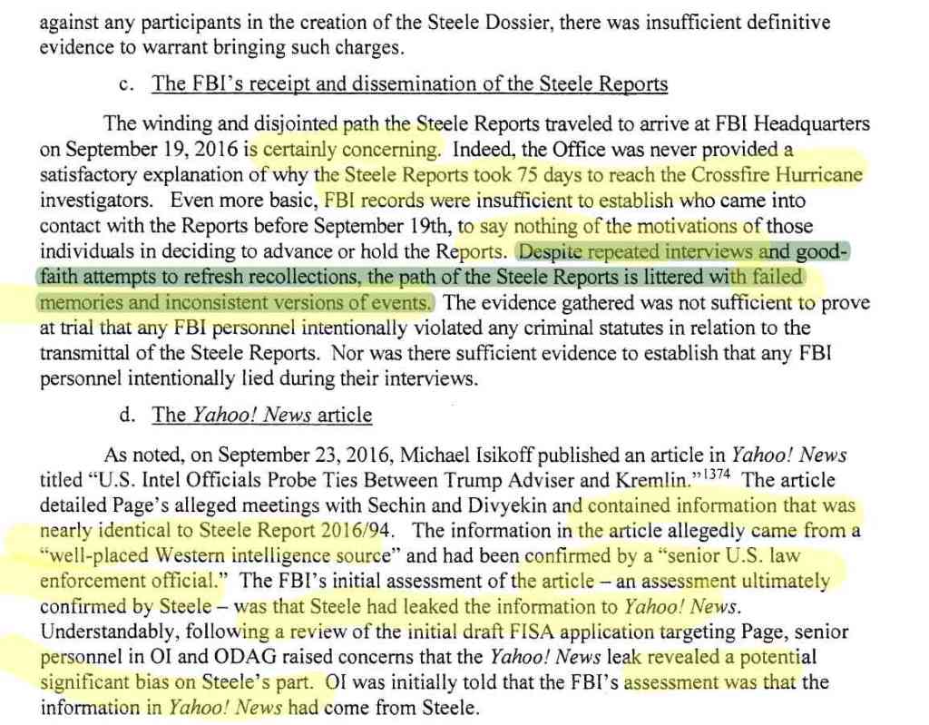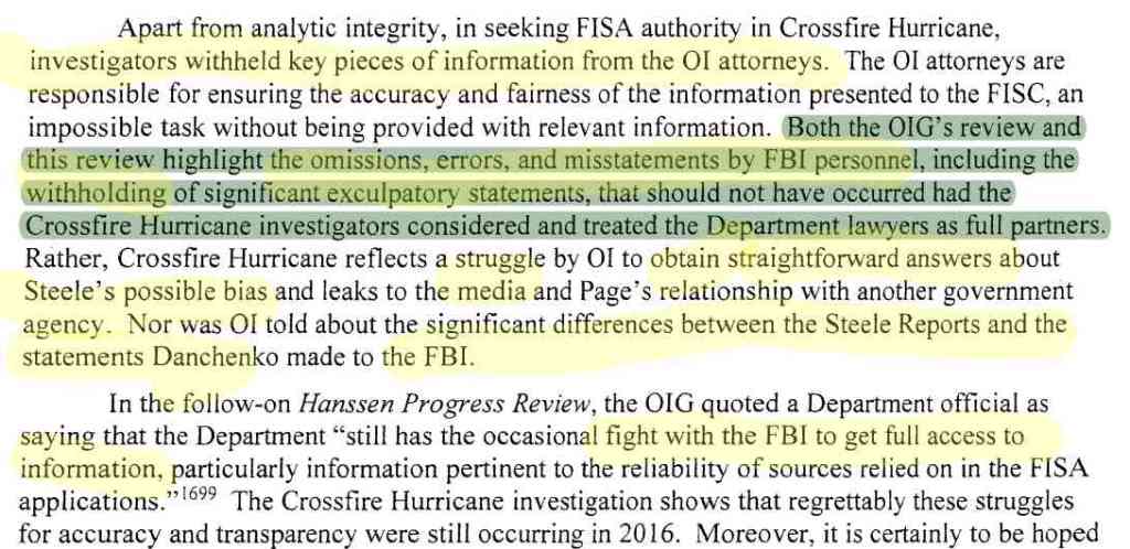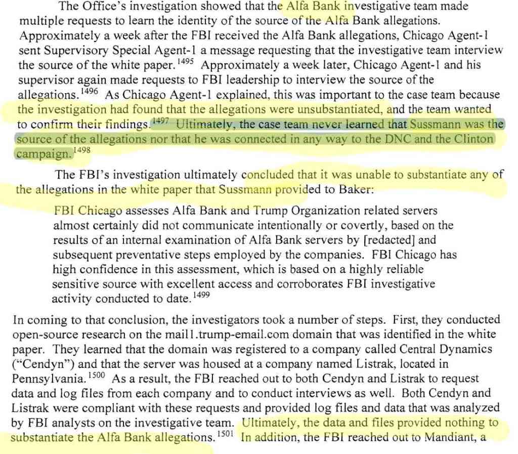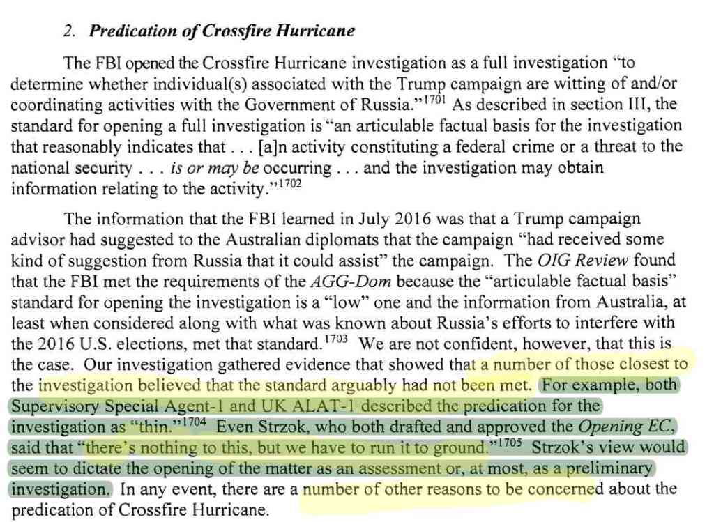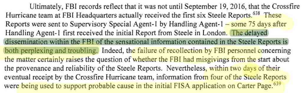 I rapporten framkom bland annat att chefen för CIA, John Brennan, några dagar innan FBI:s undersökning (kallad Crossfire Hurricane) om eventuellt samröre mellan Trump och Ryssland inleddes, informerade bland annat Obama och Biden (som då var president resp. vice-president ) samt FBI-chefen James Comey om att Hillary Clinton hade en plan som gick ut på att svartmåla Trump och låta påskina att ett sådant samband av ryskt inflytande skulle finnas. Man får anta att några anledningar var för att avleda bland annat från hennes egna privata mailserverskandal, och för att fortsatt ta emot mutor från utlandet via Clinton Foundation (donationerna till Clinton Foundation sjönk som en sten efter att det visade sig att hon inte blev president).