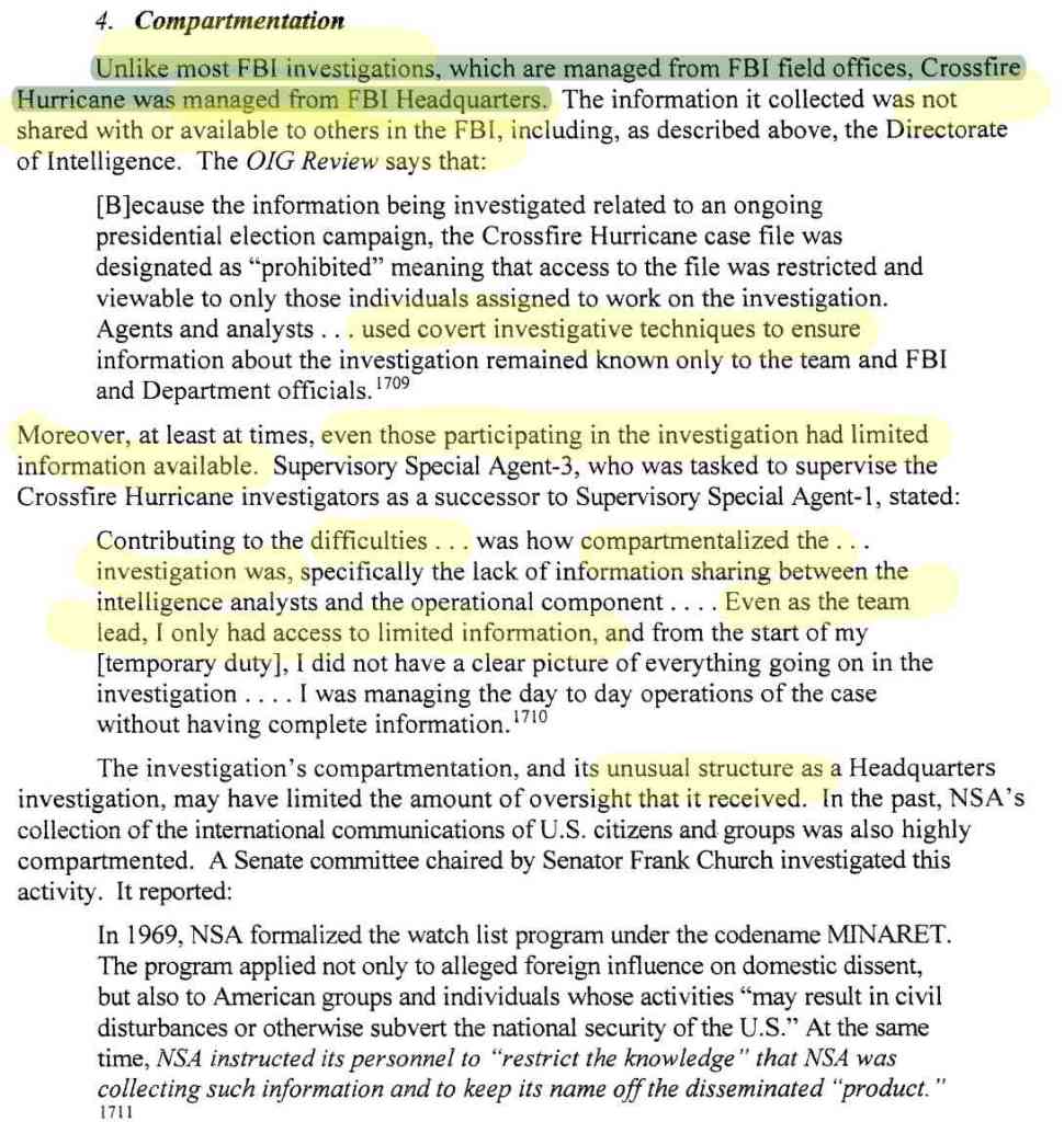 Till skillnad från vanliga FBI-undersökningar som brukar skötas av fältkontor, sköttes Crossfire Hurricane av FBI:s ledning på huvudkontoret, med katastrofala (men får man faktiskt anta avsedda) följder. Riktigt dramatiskt blir det av det faktum att ledningen visste att Hillary Clinton hade för avsikt att svartmåla Trump just på det sätt som skedde, under pågående valrörelse. Inte bara ledningen för FBI kände till detta, utan även ledningen för CIA, och självaste president Obama (som ville tillse att ”rätt personer” jobbade på fallet, dvs. Trumphatare) samt dåvarande vicepresident Biden.