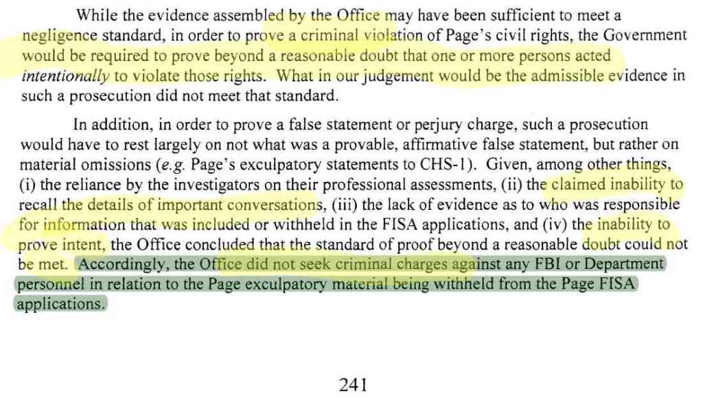 Det kommer för många som en besvikelse att knappt några åtal har väckts av Durham och hans team. Enbart Kevin Kleinsmith (en tidigare FBI-advokat som förfalskade ett e-postmeddelande för att förnya ett FISA-övervakningsbeslut av Carter Page) dömdes till 12 månaders villkorlig dom och 400 timmars samhällstjänst. Trots att det räknas upp solklara exempel på hur lagbrott begåtts, till och med landsförräderi, påstås det i Durhams rapport att det saknas bevis för att en domstol ska tänkas fälla. Vilket också visade sig vara sant i de få fall där åtal väcktes: solklart skyldiga fall friades.