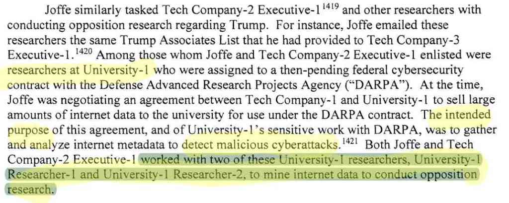 T.ex. fallet Michael Sussman, som var advokat för Hillary Clintons valkampanj. Han påstod uttryckligen att han inte informerade CIA och FBI å någon annans vägnar när han spred de falska ryktena till dem, trots att påståendena var beställda av just Hillary Clinton och hennes valkampanj, att de kommit överens om att han skulle göra det, och att han fakturerade dem för det. Trots den uppenbara lögnen friades Sussman av en jury 31 maj 2022 från anklagelsen att ha ljugit för CIA och FBI.